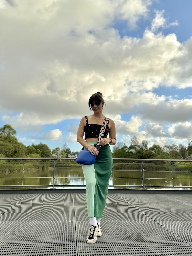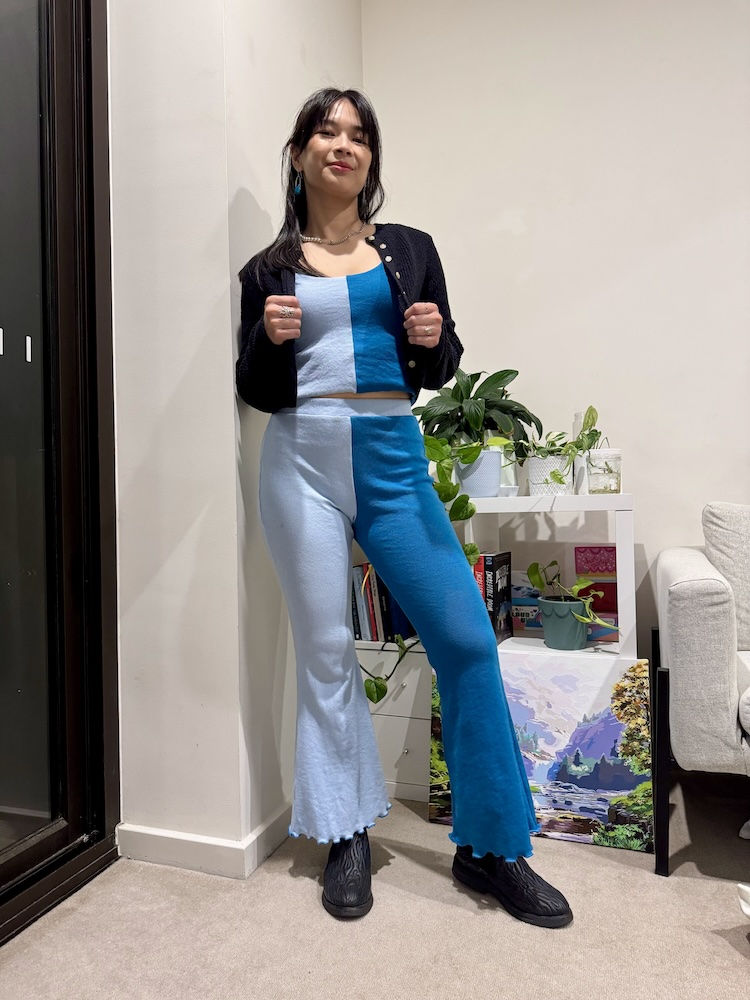 From the same collection as the midi skirts. I purchased the two-tone blue flared pants first, but realised I should have made the inseam longer. The green flares have a slightly longer inseam.